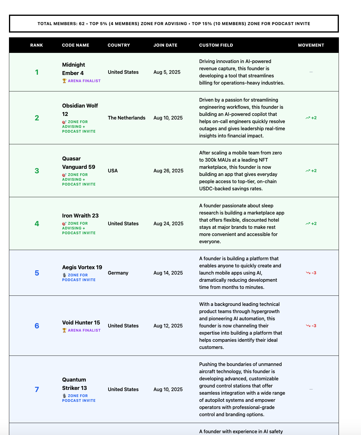 This all plays out through a leaderboard. Every week, we rank users based on their score (signal + effort + progress), creating a live system of accountability and progress. At the end of August, I picked the top 1% of founders and started advising them. I also invited the top 10% onto my podcast. The filter worked. I was genuinely impressed with the people I met.